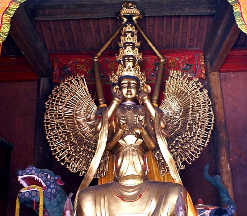 千缽文殊銅象,供奉在千缽文殊殿內。這尊銅像,造型奇特,上疊五個頭像;胸前有手六只,其中的兩只捧著一個金缽,缽內坐著釋迦牟尼佛,背后向四周伸出一千只手,每只手上都有一個金缽,每個缽內都有一尊釋迦牟尼佛。所以,這尊銅像又被叫做千臂千缽千釋迦文殊像。這尊像金光燦爛,鑄于明代,全國少有。